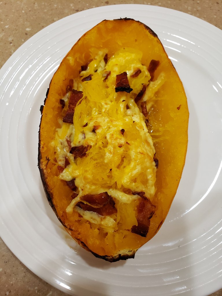 I reserved half of the spaghetti squash for tonight, and while cooking some chicken, I rummaged around in my pantry for some maple syrup. The purists will gag now, because I personally have never liked “real” maple syrup, and my kids don’t like syrup on their pancakes or waffles. Since we hadn’t eaten either in a year, I was actually surprised to find a bottle of maple flavored high fructose corn syrup in my pantry. A glance at the label said 26 carbs per serving. Whoah! Then, I saw that a serving was a quarter cup. I asked Alexa how many teaspoons were in a quarter cup. Upon learning that it was 12, quick math said I could afford to mix in one teaspoon, and divide it between the two of us.